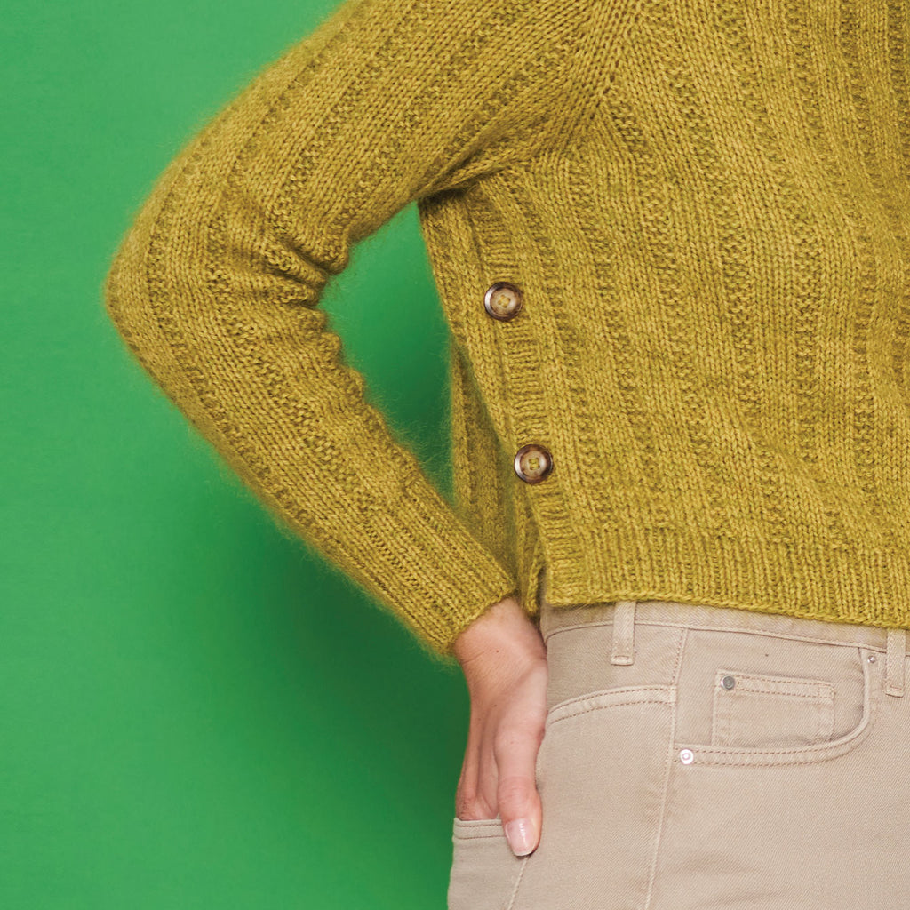 Efter halskanten tages der ud ved skuldrene, hvorefter bærestykket strikkes med raglanudtagninger. Arbejdet deles og ærmer, for- og bagstykke strikkes færdige hver for sig. Til slut strikkes knap- og knaphulskanter i begge sider.
