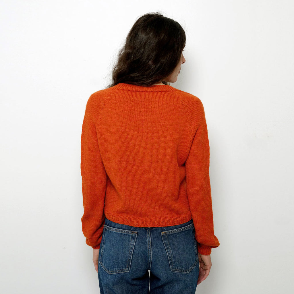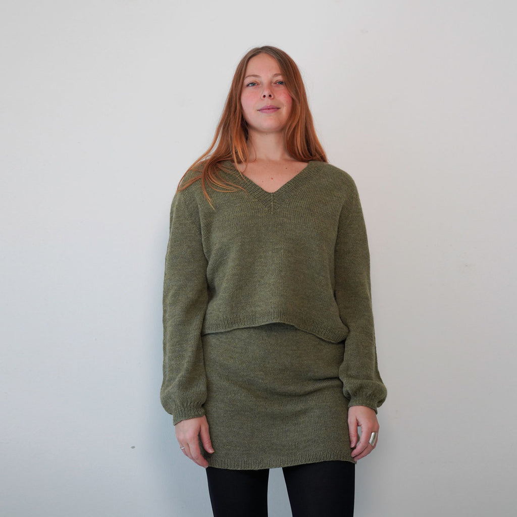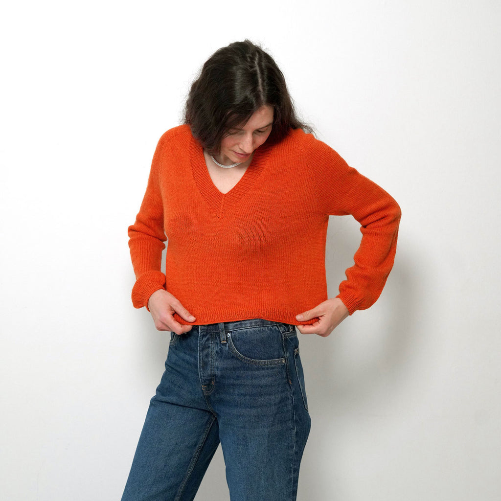 Der sættes masker af til ærmer, og kroppen strikkes færdig. Ærmerne strikkes, og til slut samles der masker op til hals, der strikkes rundt i rib, mens V’et dannes foran med centrerede indtagninger.