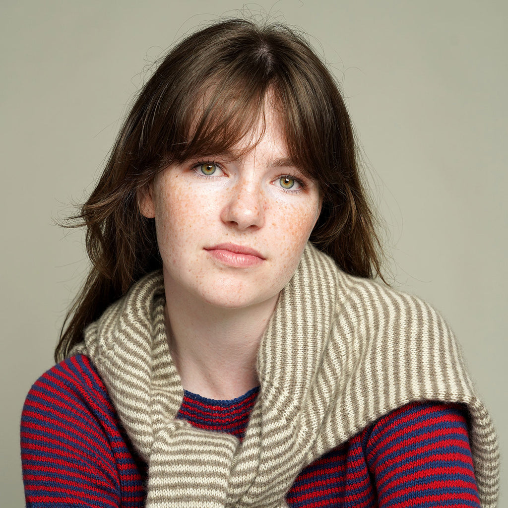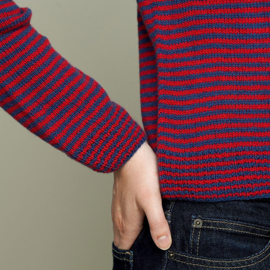 Esjan Bluse strikkes i glatstrik nedefra og op. Kanterne strikkes i perlerib og krop og ærmer i smalle striber. Krop og ærmer strikkes hver for sig og samles til bærestykket, hvor der laves raglanindtagninger med en lille ribdetalje.