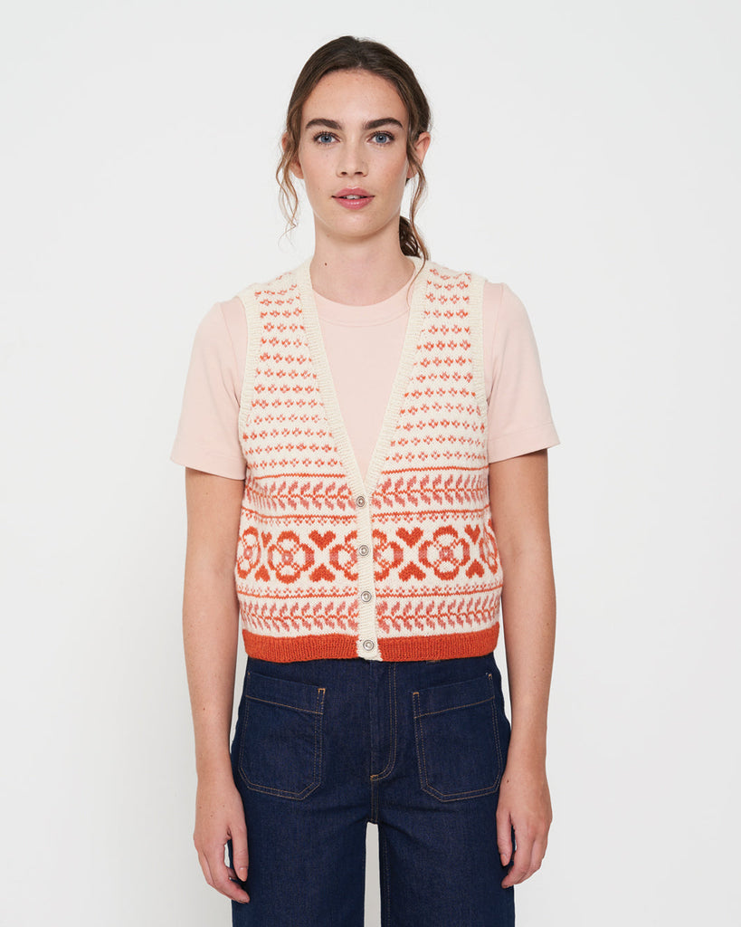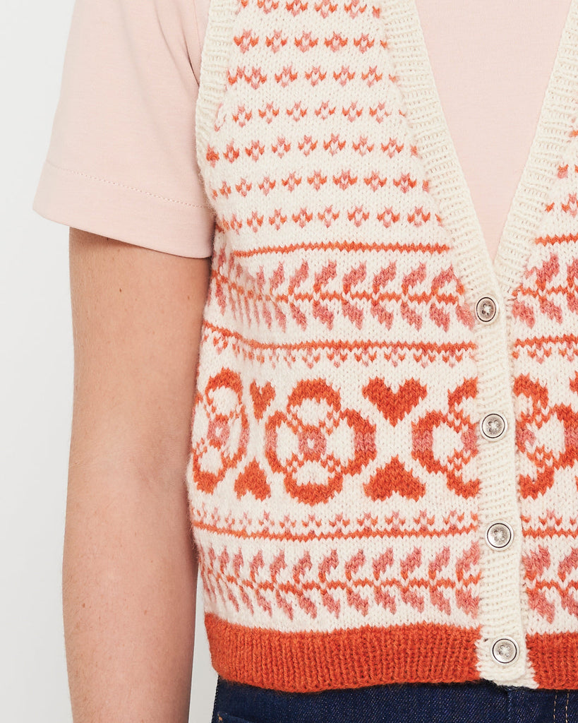 Fejan Vest strikkes rundt nedefra og op med klippemasker midtfor og ved ærmegab. Vesten strikkes i flerfarvemønster med to farver ad gangen. Du afslutter med ribkanter og bånd langs den klippede kant.