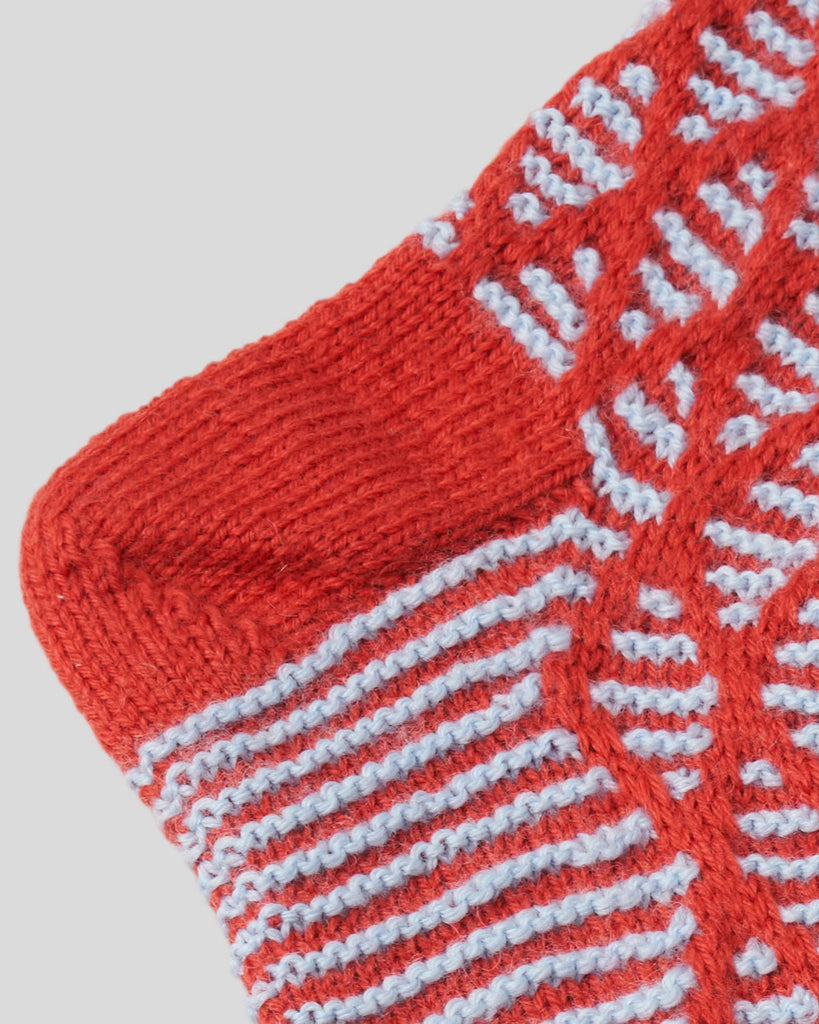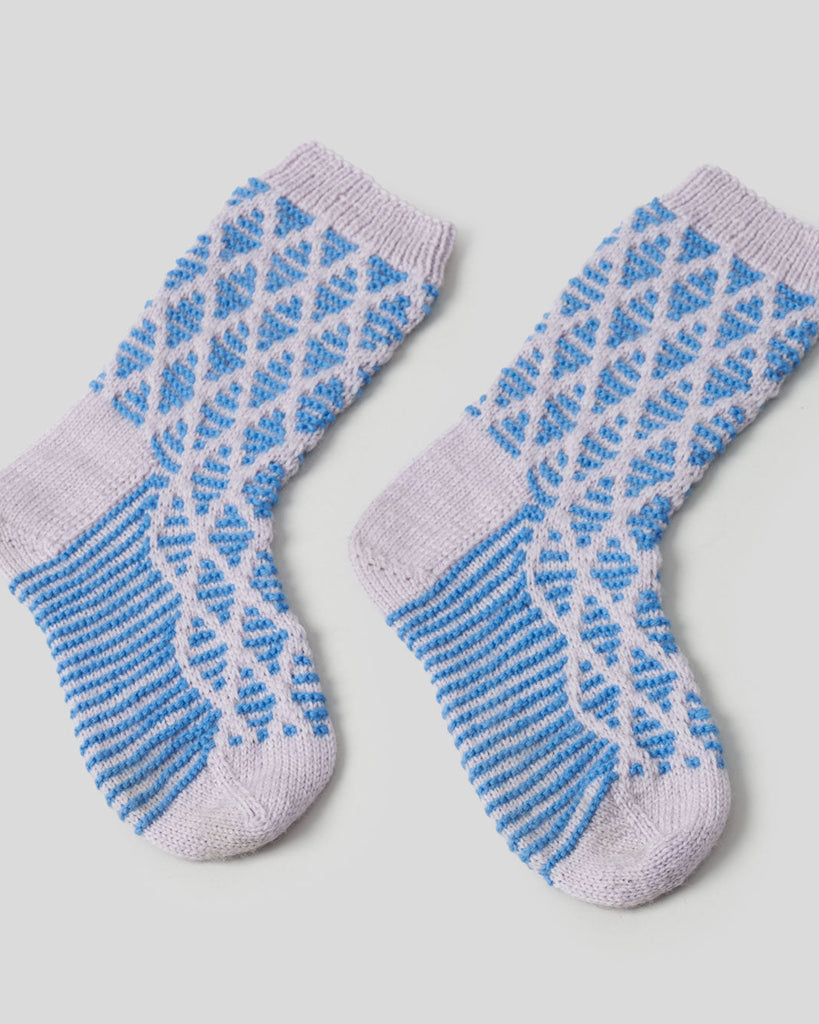 Frederiksø Strømper strikkes i mønster med hævemasker - også kaldet vævestrik - i to farver. Der strikkes oppefra og ned med almindelig kilehæl.