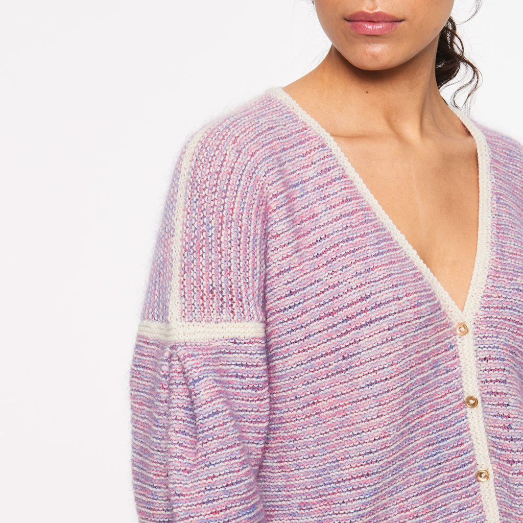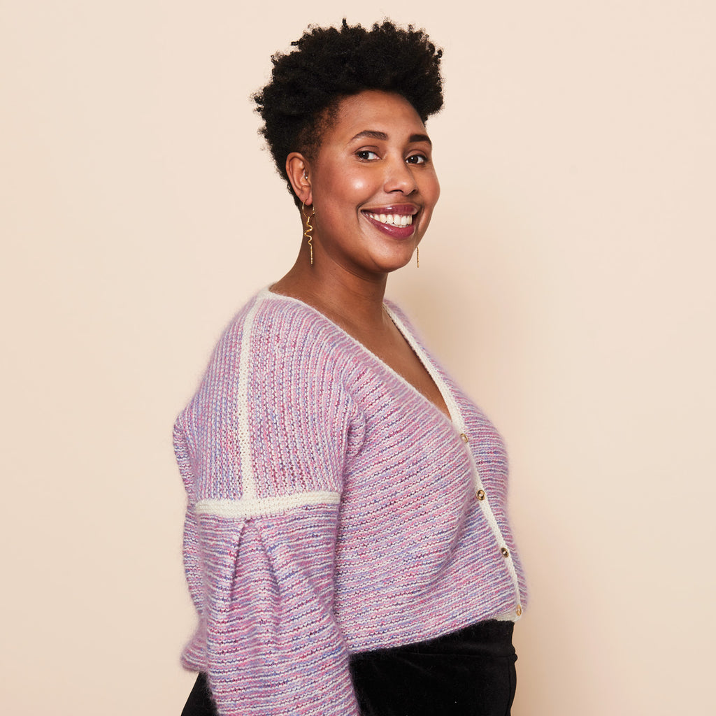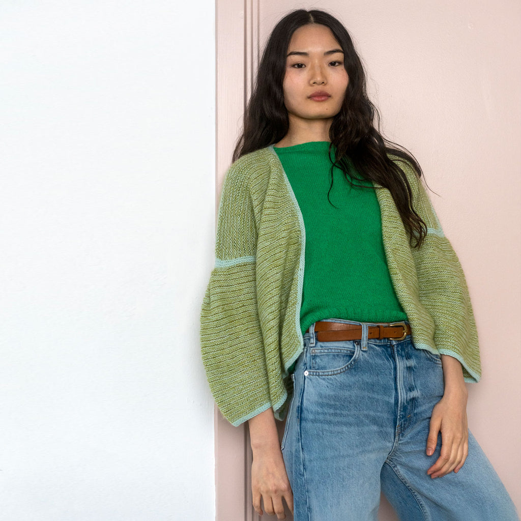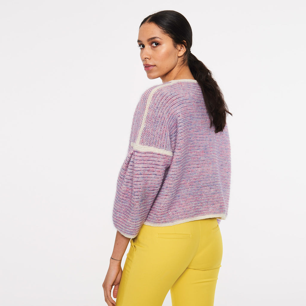 Grunnet Cardigan strikkes frem og tilbage nedefra og op i striber og retriller. Striberne strikkes skiftevis i en tråd uld og to tråde mohair i forskellige farver. Cardiganen har V- hals og wienerlæg på ærmerne. Den er det oplagte projekt til alle dine mohairrester.