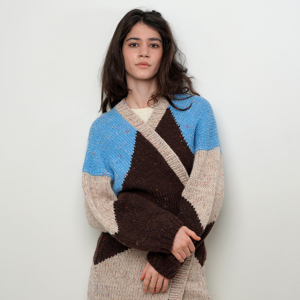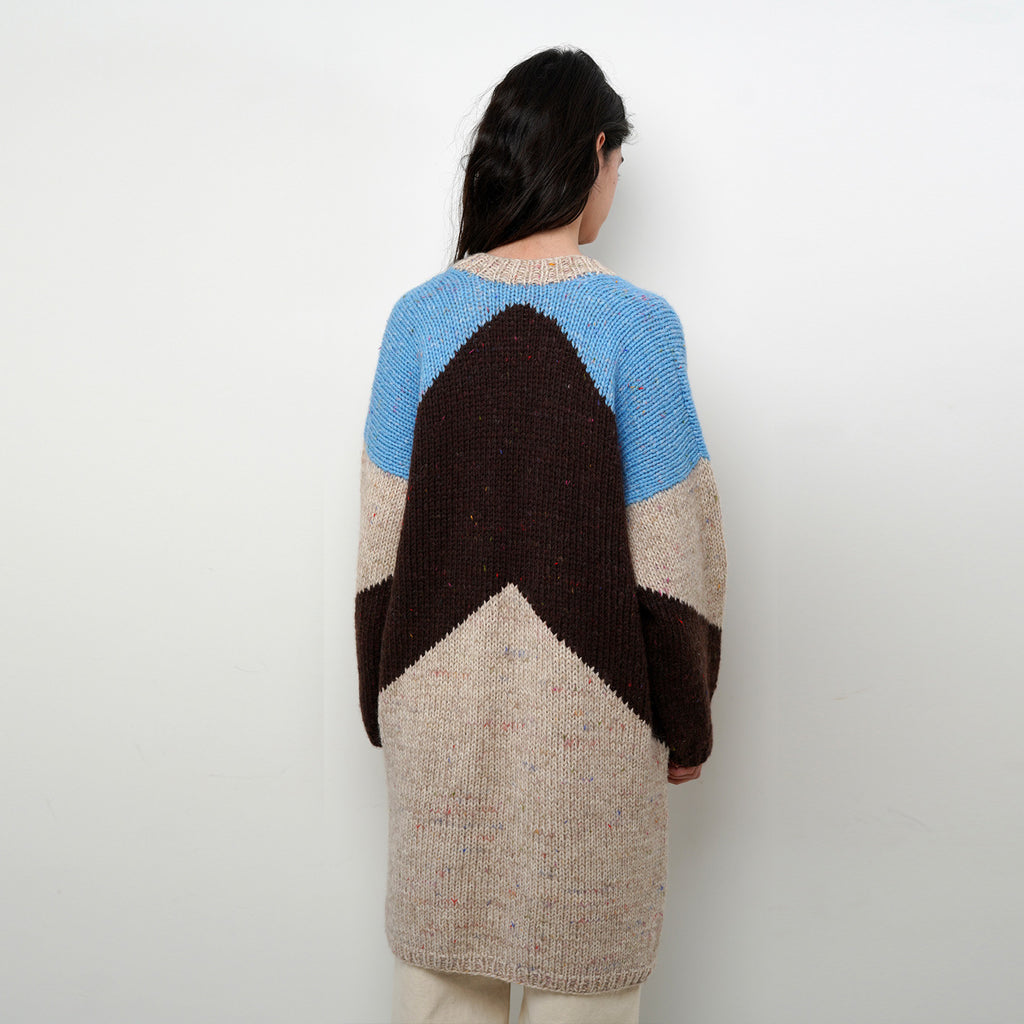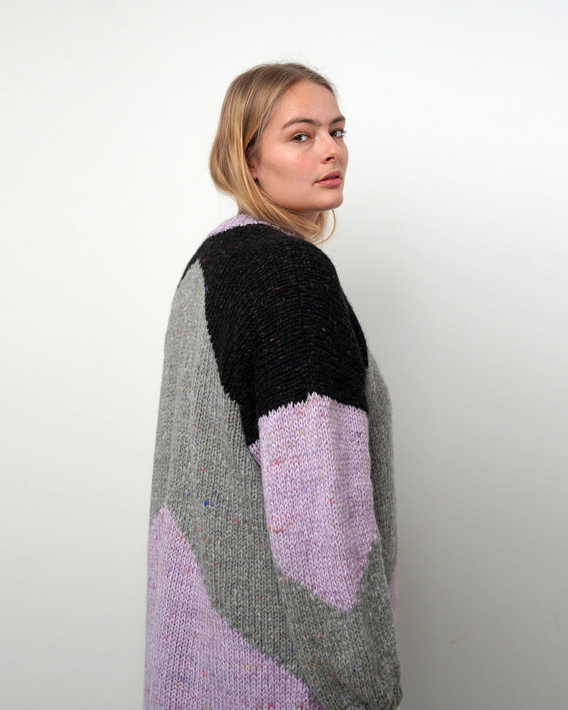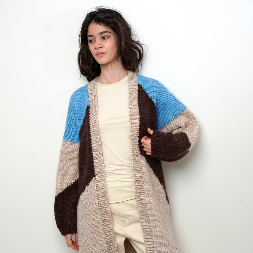 Island Cardigan strikkes i gobelin-teknik med en tråd Highland og en tråd Blow holdt sammen. Kroppen strikkes nedefra og op – forstykker og bagstykke hver for sig. Der strikkes masker op til ærmer i ærmegabene, og ærmerne strikkes oppefra og ned. Arbejdet afsluttes med en ribkant langs forkanter og nakke.