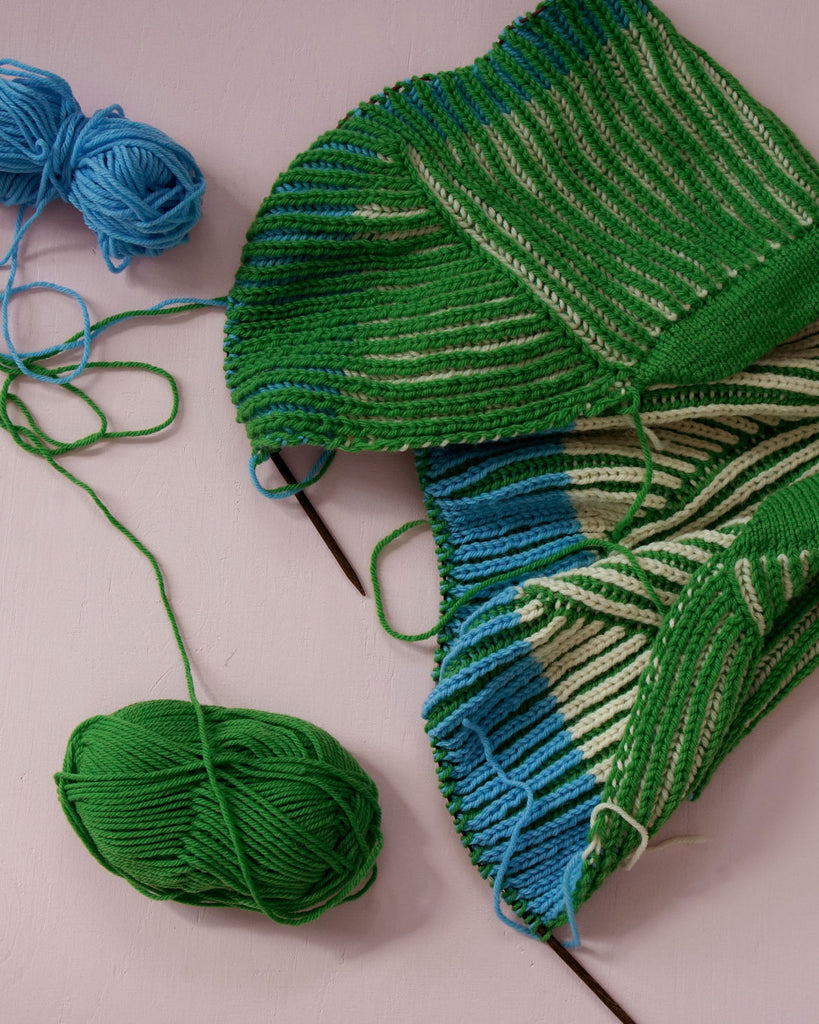 Karrat Bomber strikkes oppefra og ned i tofarvet patent frem og tilbage med udtagninger på bærestykket. Herefter deles arbejdet, og krop og ærmer strikkes hver for sig. Halskanten strikkes i glatstrik med vendepinde og ombuk. Forkanterne strikkes i rib. Til slut monteres forkanterne med bånd og tryklåse.