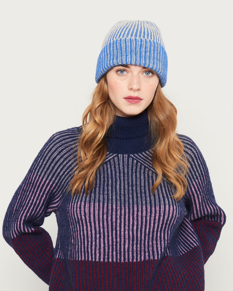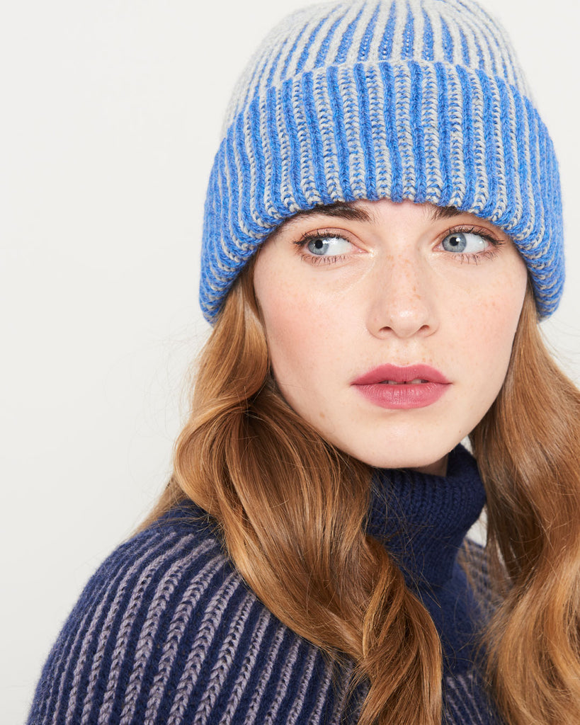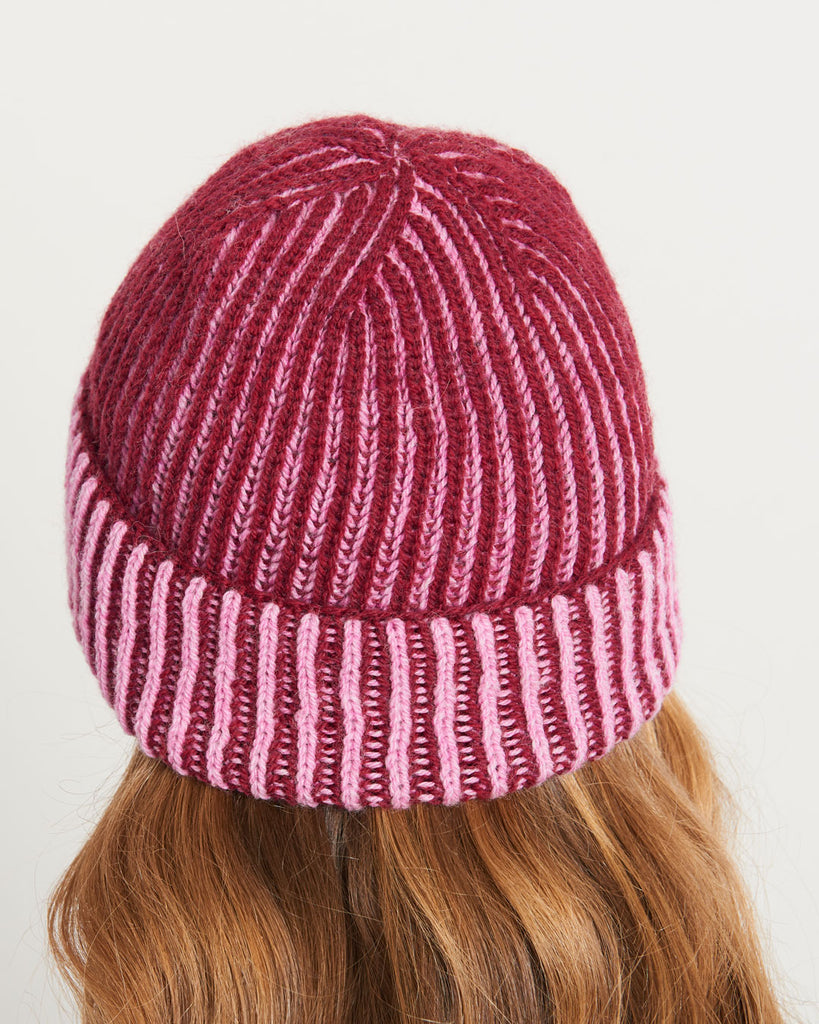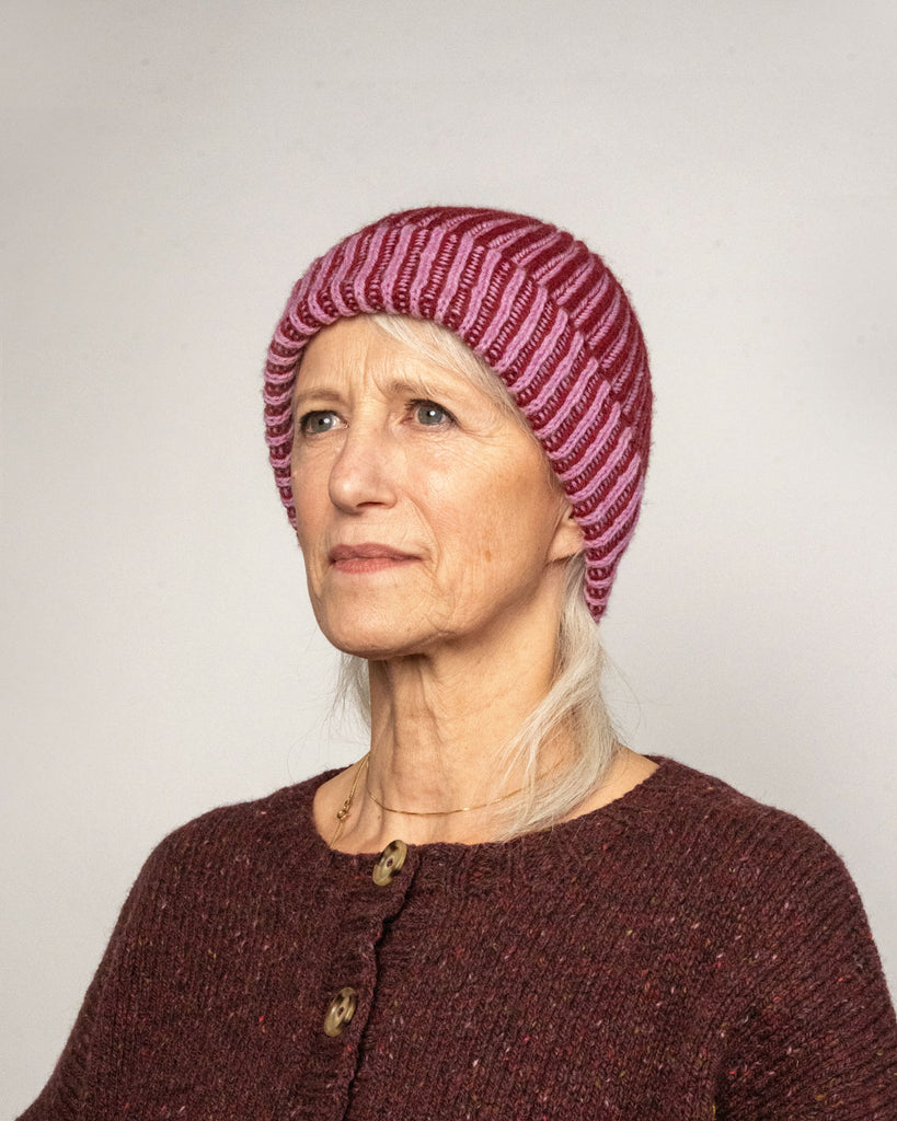 Karrat Hue strikkes rundt i tofarvet patent. Der laves indtagninger den sidste del af huen, og som aflukning føres garnenden igennem de resterende masker.