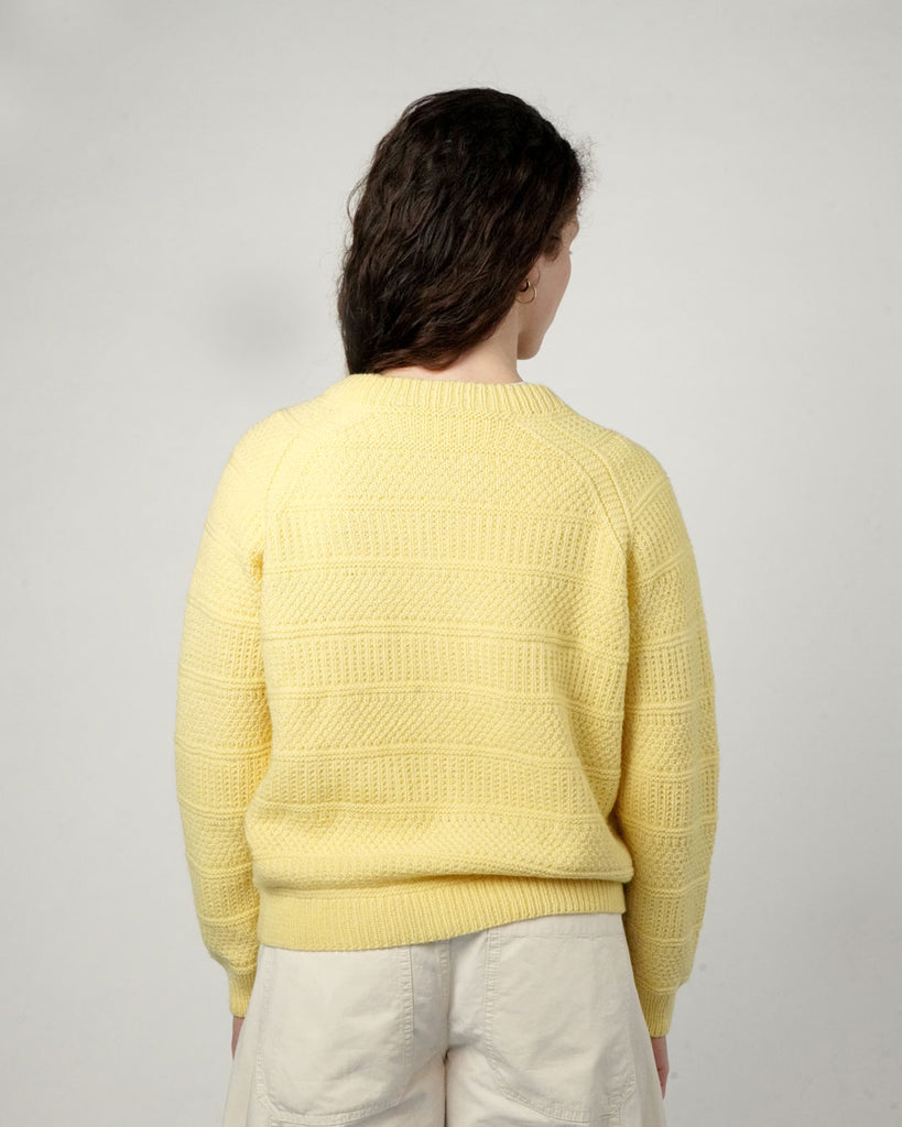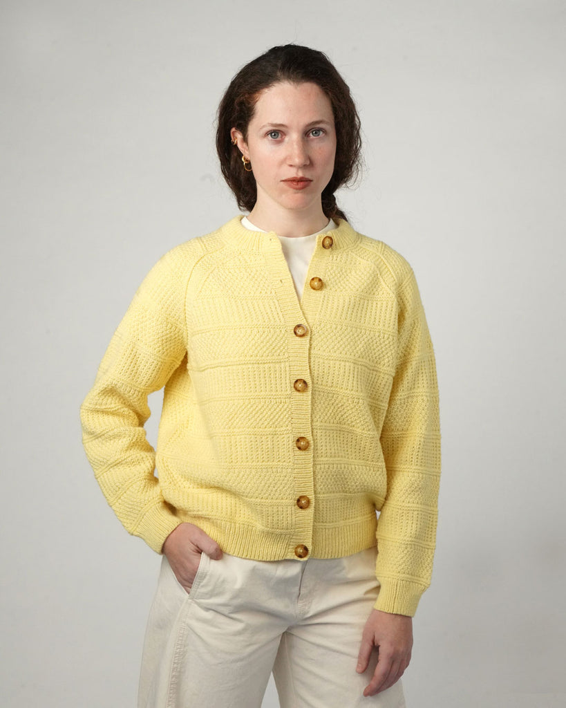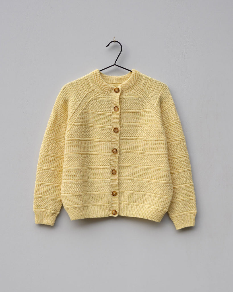 Mykines Cardigan strikkes nedefra og op i strukturmønster efter diagram. Krop og ærmer strikkes hver for sig og samles til bærestykket, der strikkes med raglanindtagninger. Til slut strikkes knap- og knaphulskanter.