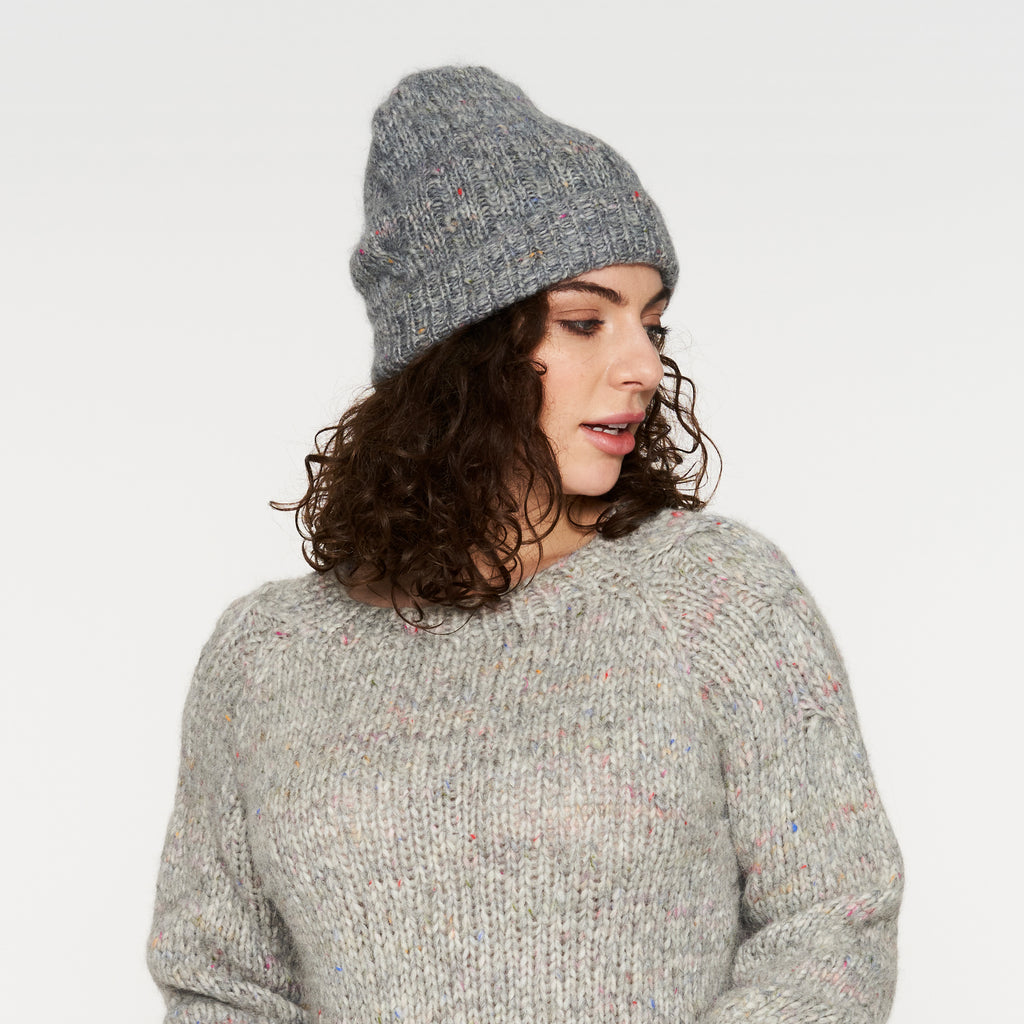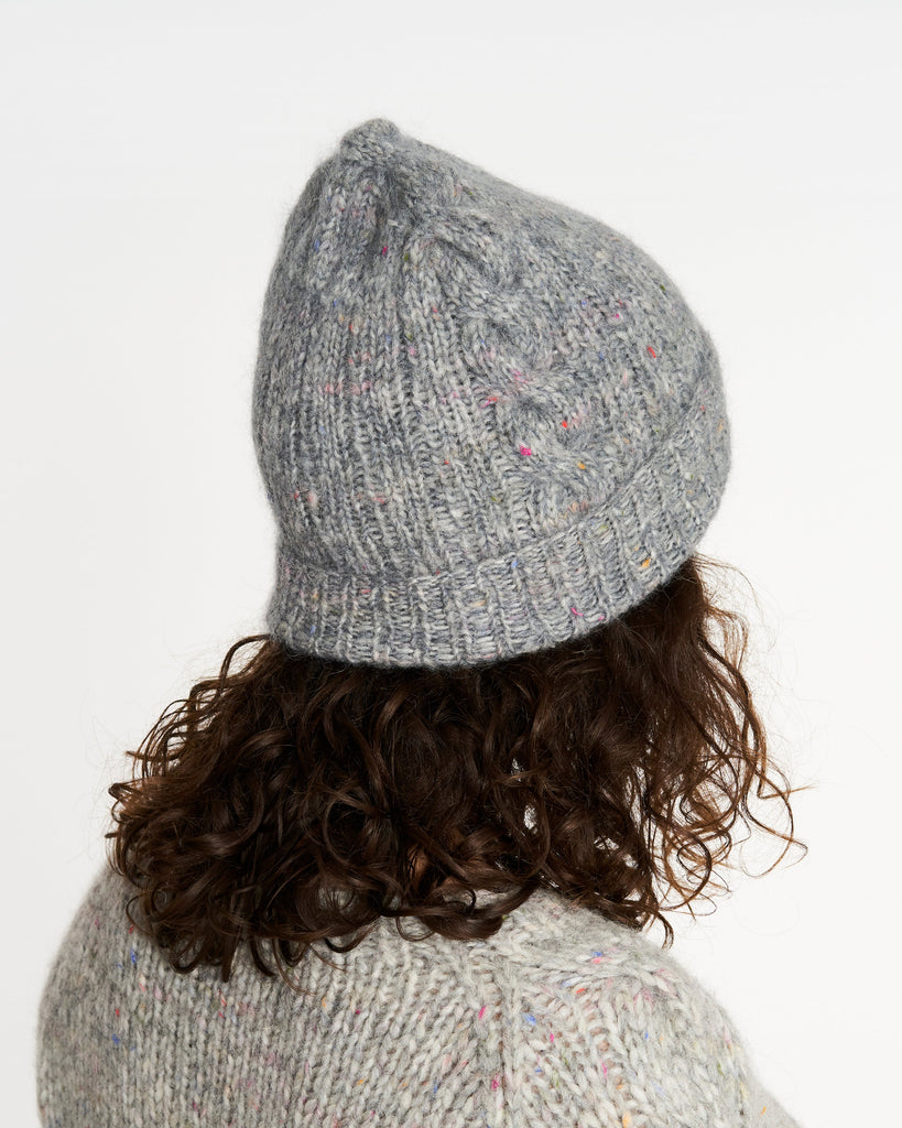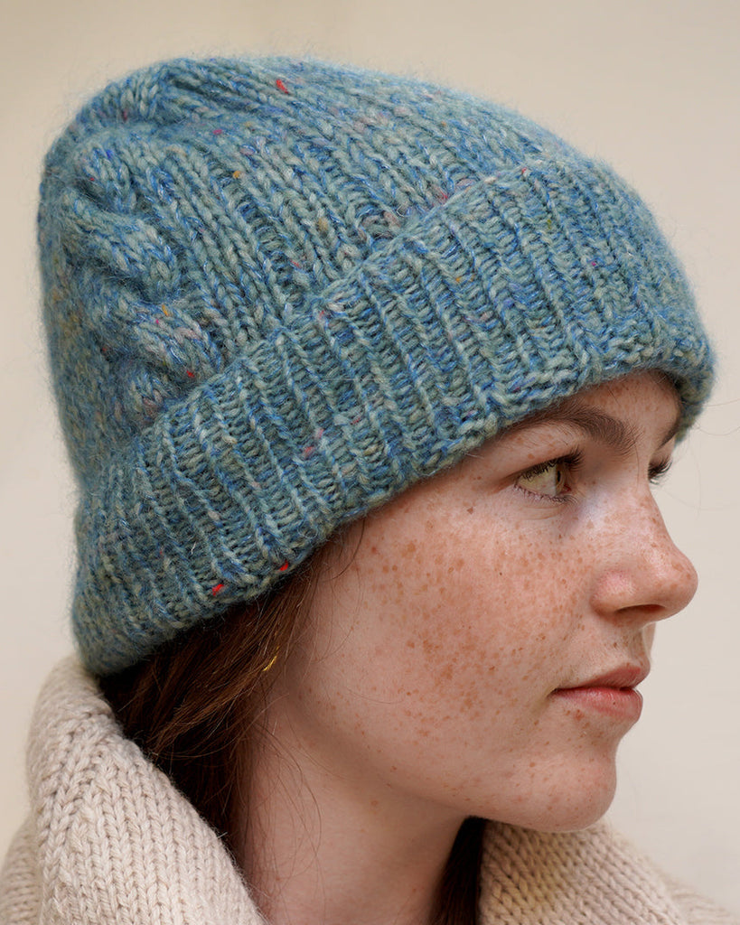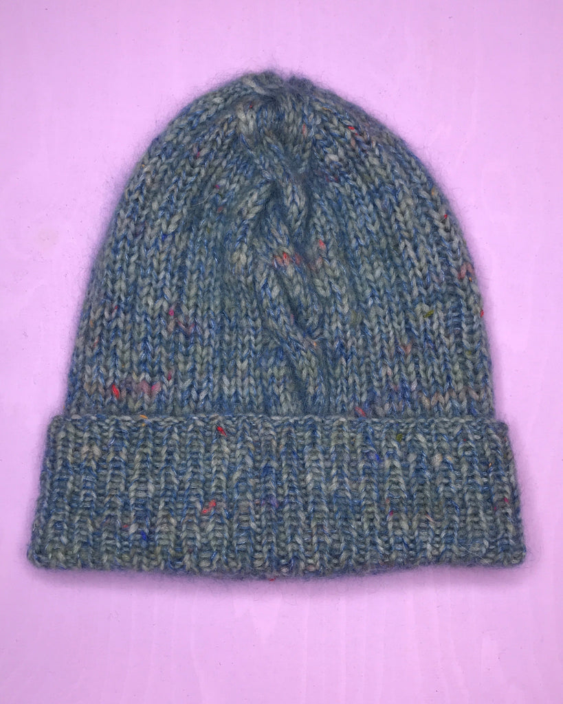 Samsø Hue strikkes i en bred ribstruktur med snoninger i siderne. Snoningerne fortsætter som et bånd hen over huens top.