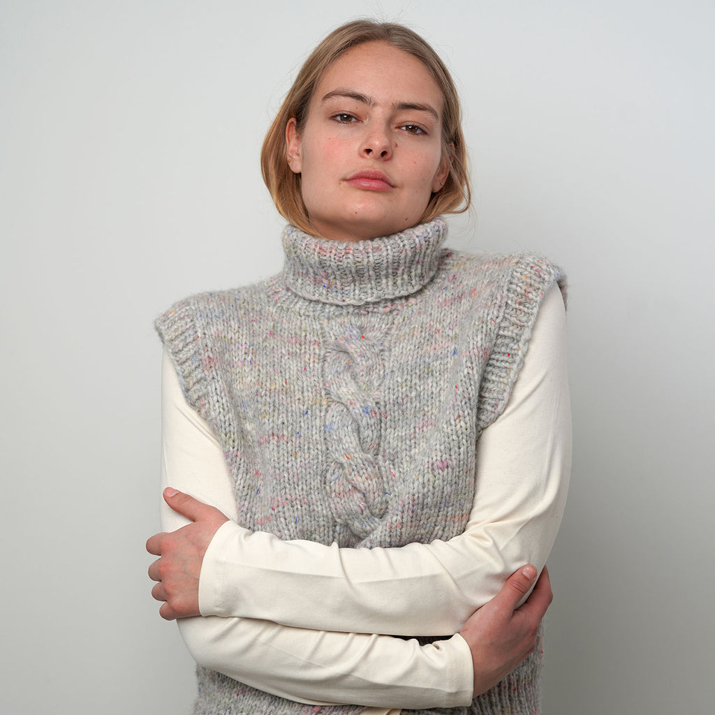 Samsø Slipover strikkes nedefra og op i to tråde Blow. Slipoveren har en rullekrave i rib, en slids nederst i ribkanten midt bag samt snoninger midt for og bag.