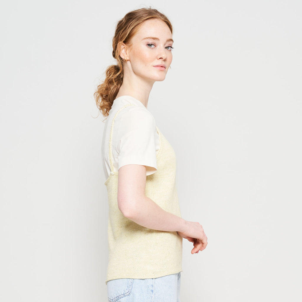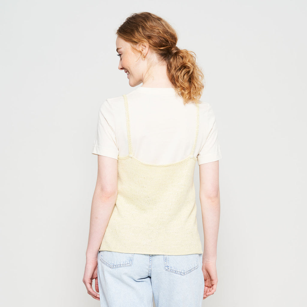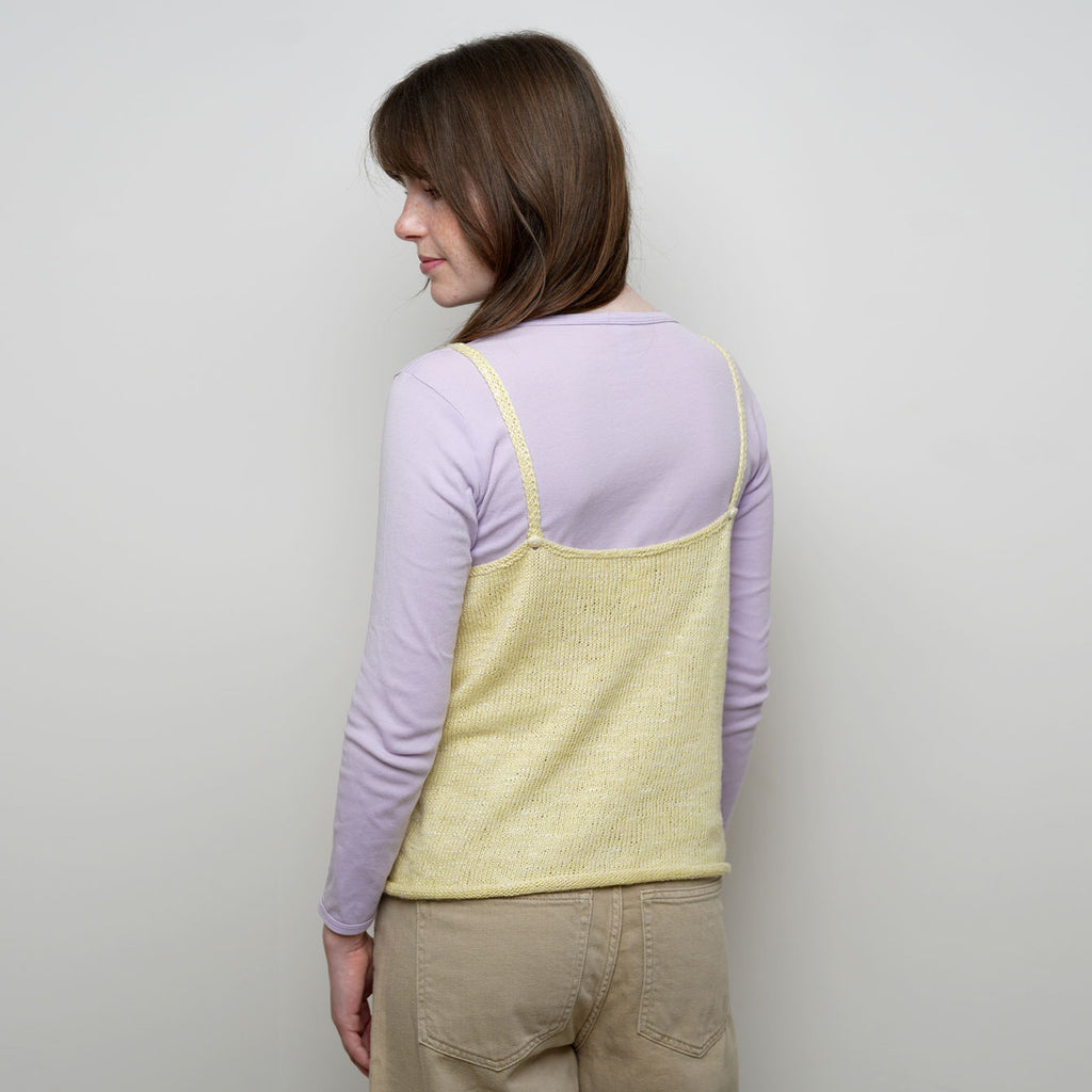 Selaö Top strikkes nedefra og op. Toppen har retrille-detajler langs kanterne ved ærmegab og langs udskæringen. Nederst har toppen en rullekant, der strikkes på mindre pinde. Stropperne har knapper, så længden kan justeres.