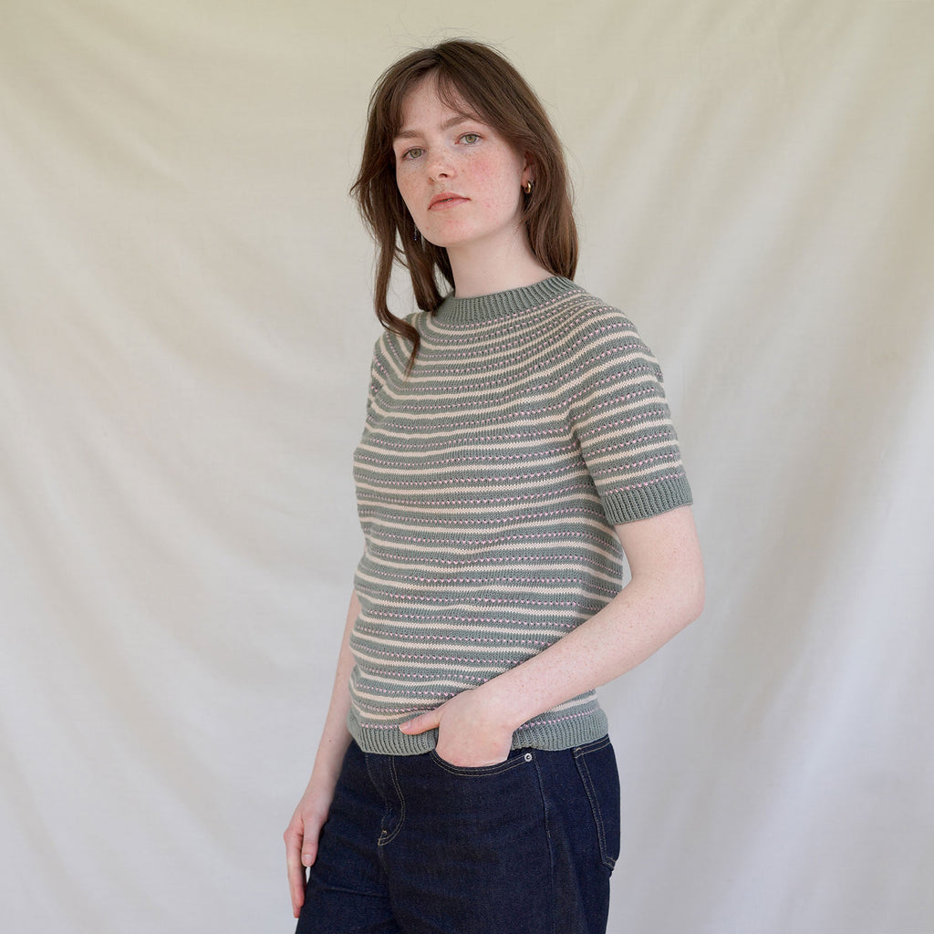 Sørøya T-shirt strikkes oppefra og ned i mønster med striber og vævestrik. Først strikkes udtagninger jævnt fordelt ned over bærestykket. Herefter deles arbejdet, og krop og ærmer strikkes hver for sig – stadig i mønster. Ærmer og krop afsluttes med kanter i drejet rib. Til slut strikkes der masker op til halskanten, som også strikkes i drejet rib.