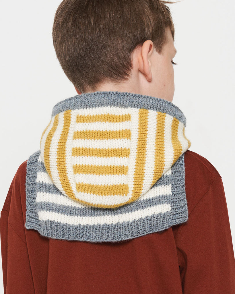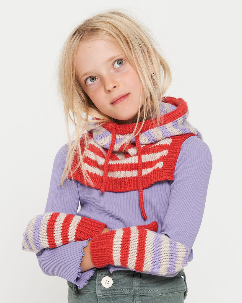 Sotra Hætte og Vanter strikkes i glatstrik og striber. Der strikkes med to tråde Merino holdt sammen gennem hele opskriften. Hætten er strikket oppefra og ned, idet der først strikkes et panel på toppen af hætten, derefter samles masker op langs siderne. Hætten afsluttes med en løbegang med I-cord samt rib i begge skulderslidser. På vanterne strikkes en kontrasttråd ind, hvor tommelen skal strikkes på. Vanterne afsluttes med indtagninger og herefter strikkes tommelen færdig.