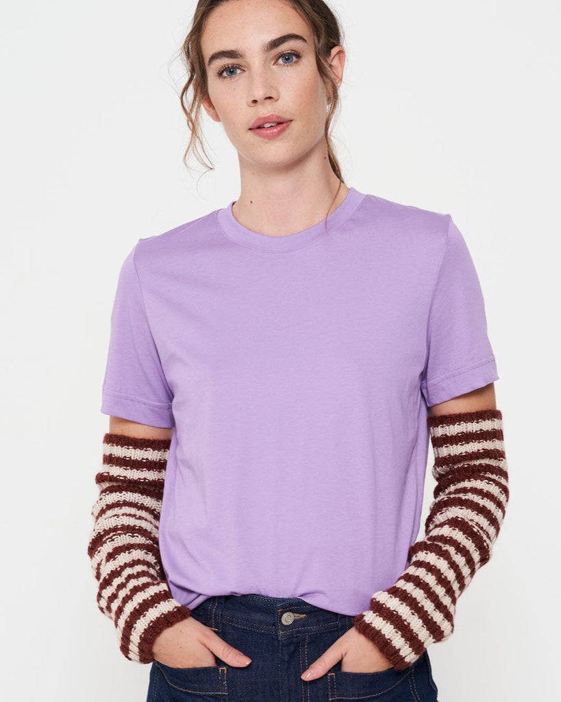 Sotra Benvarmere strikkes rundt i 2 x 2 rib og i striber med skiftevis farve A og B.