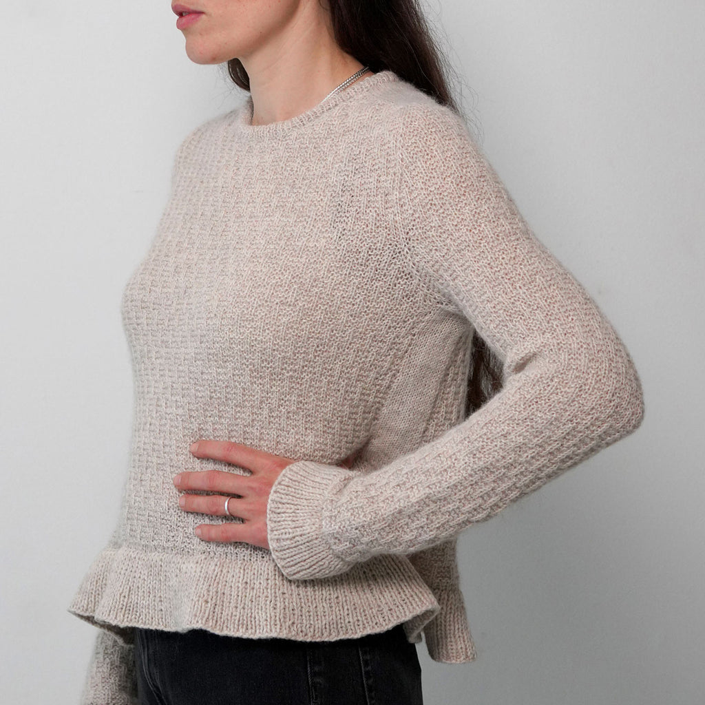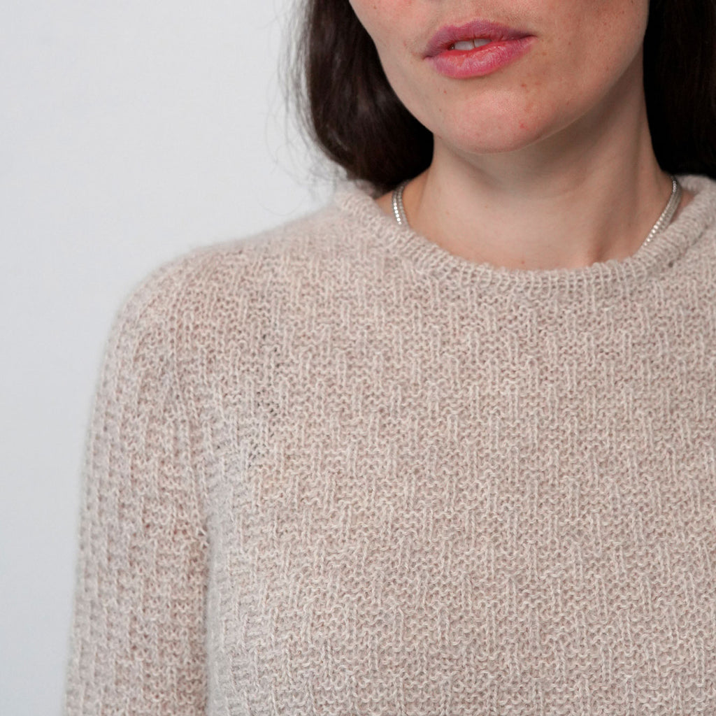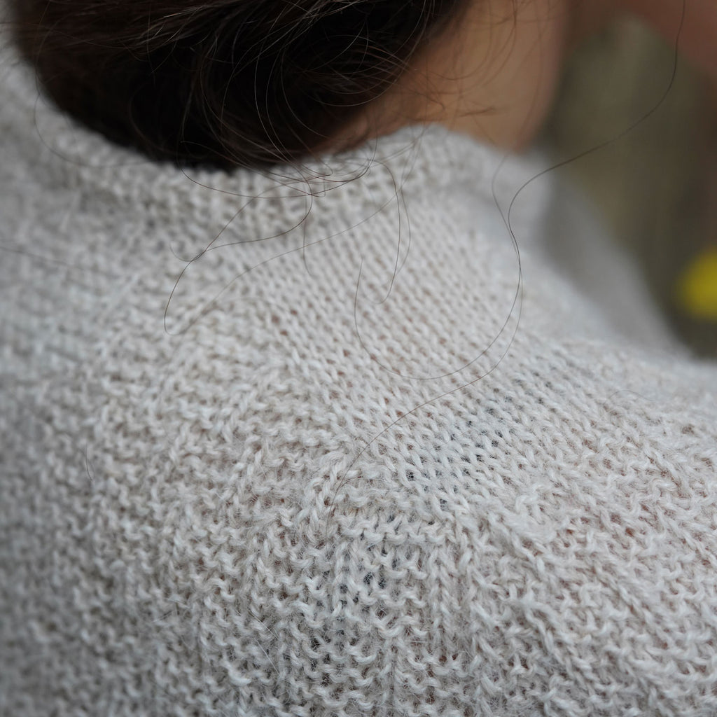 Streymoy Bluse strikkes oppefra og ned i strukturmønster og glatstrik. Først med udtagninger på skuldrene og derefter med udtagninger på ærmerne. Herefter strikkes krop og ærmer hver for sig med udtagninger på kroppen og indtagninger på ærmerne. Krop og ærmer afsluttes med ribkanter i et tykkere garn.