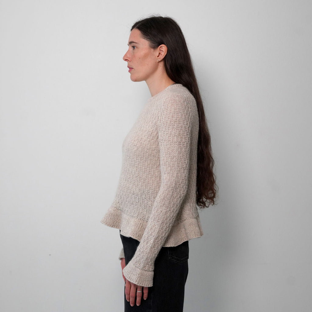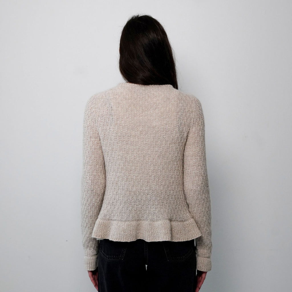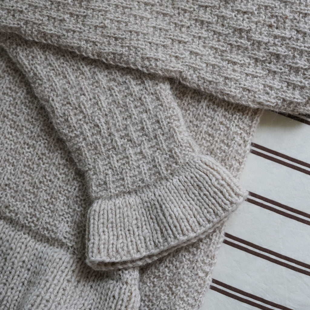 Streymoy Bluse strikkes oppefra og ned i strukturmønster og glatstrik. Først med udtagninger på skuldrene og derefter med udtagninger på ærmerne. Herefter strikkes krop og ærmer hver for sig med udtagninger på kroppen og indtagninger på ærmerne. Krop og ærmer afsluttes med ribkanter i et tykkere garn.