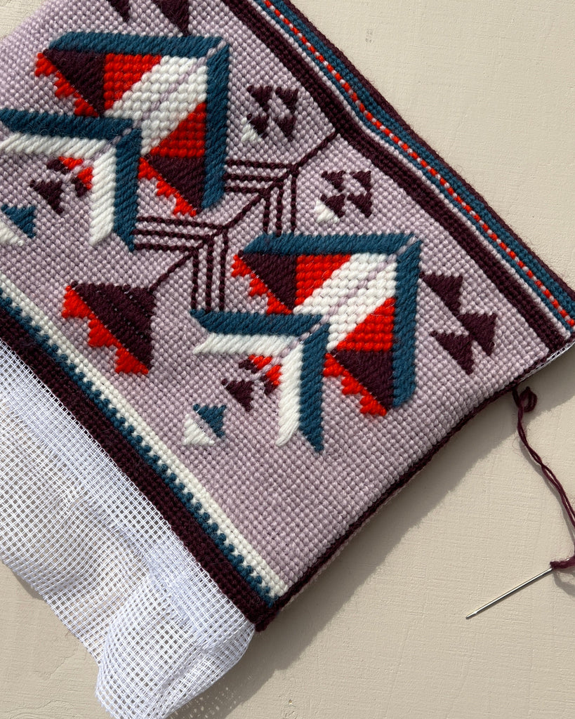 Trukhaniv Clutchen broderes i tre typer sting, som giver et flot reliefudtryk. Det grafiske mønster er designet af den ukrainske designer, Ira Simonchuck, og er inspireret af traditionelle ukrainske motiver og sting.