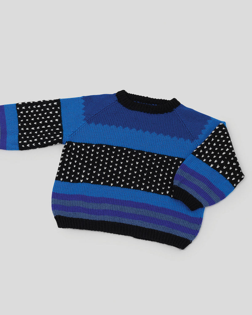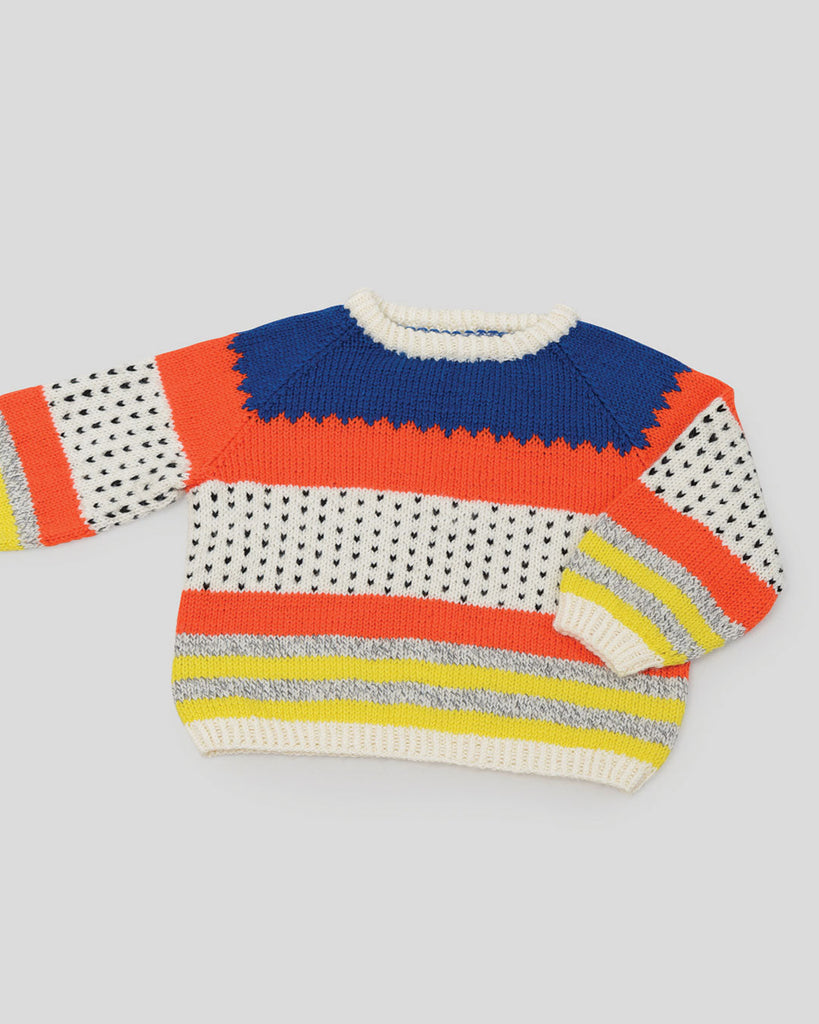 Tunø Babysæt består af to dele – en bluse og et par bukser. Begge dele strikkes i glatstrik nedefra og op i striber og med flerfarvestrik efter diagram. Designet er skabt i samarbejde med Lærke Bagger.