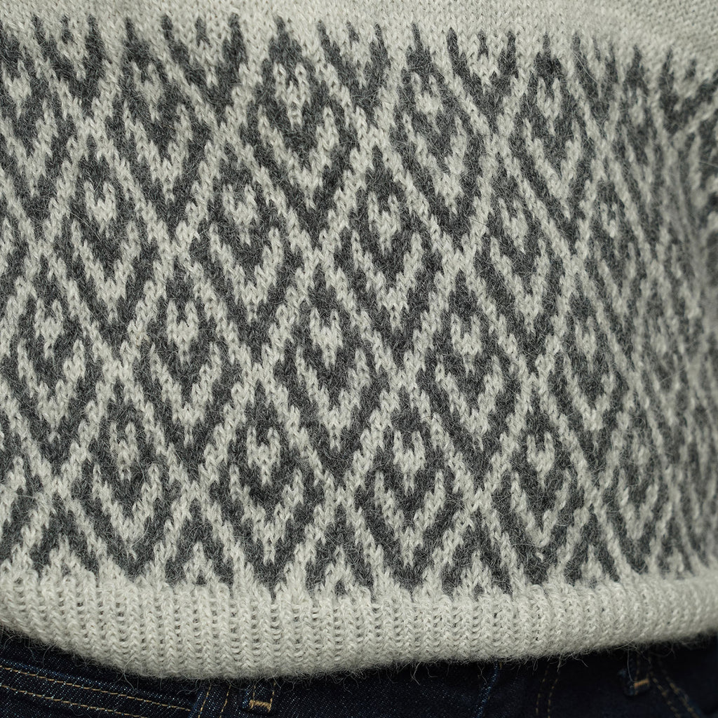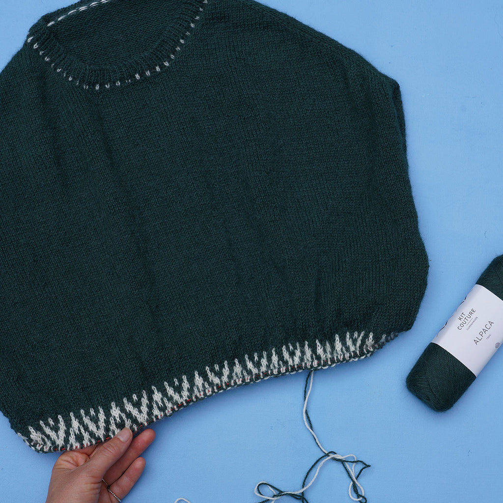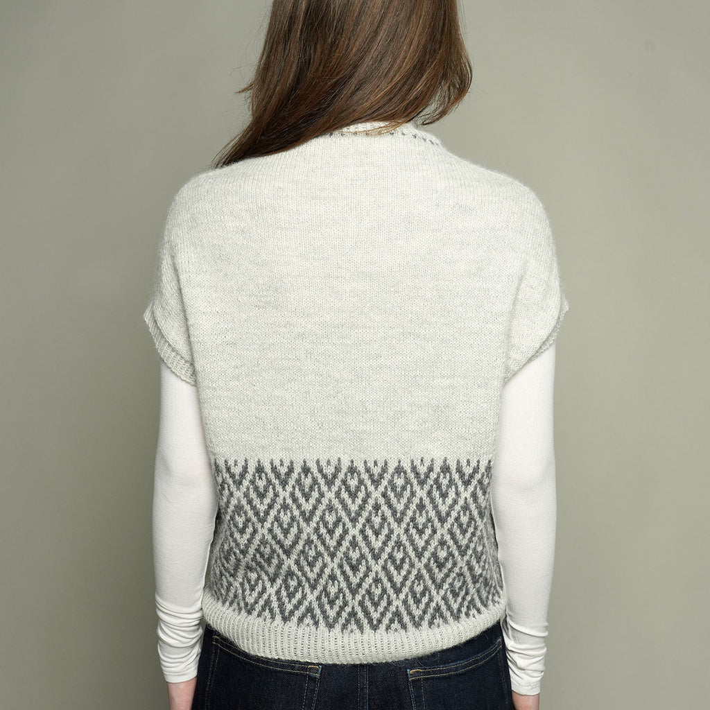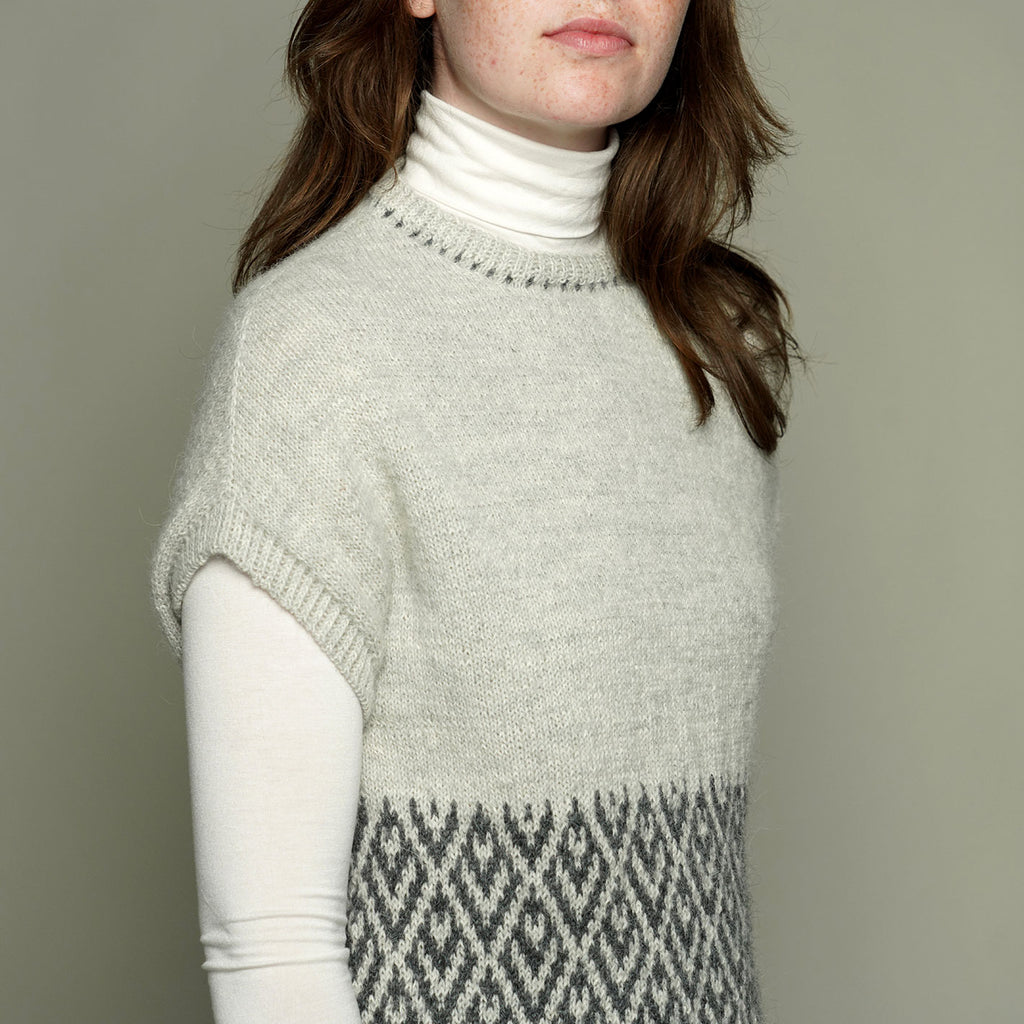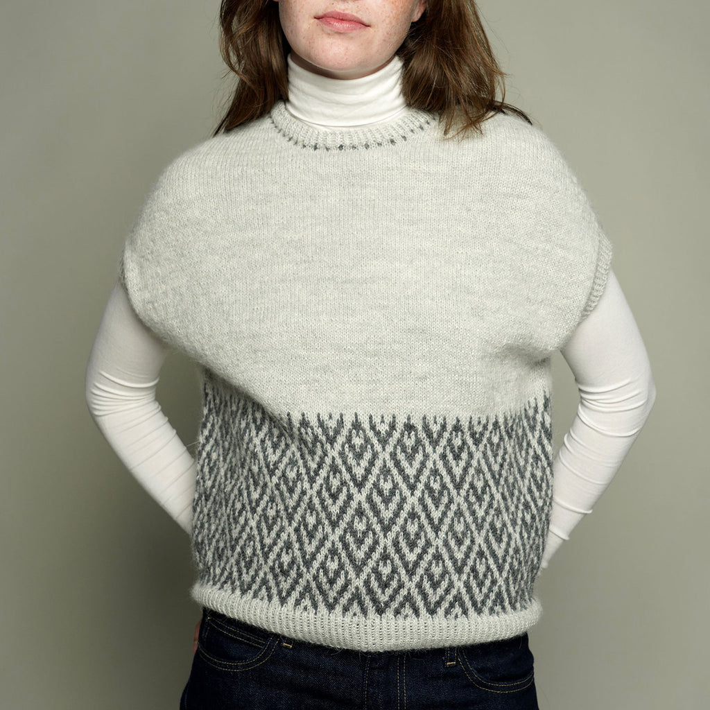 Der fortsættes rundt, til det fulde maskeantal nås, hvorefter arbejdet deles, og der strikkes frem og tilbage over henholdsvis for- og bagstykke, til ærmegabet har den passende dybde. Der fortsættes rundt med mønster nederst på kroppen. Arbejdet afsluttes med ribkant nederst og med ribkanter i ærmegab samt ved halsen, hvor der tilføjes en lille mønsterdetalje.