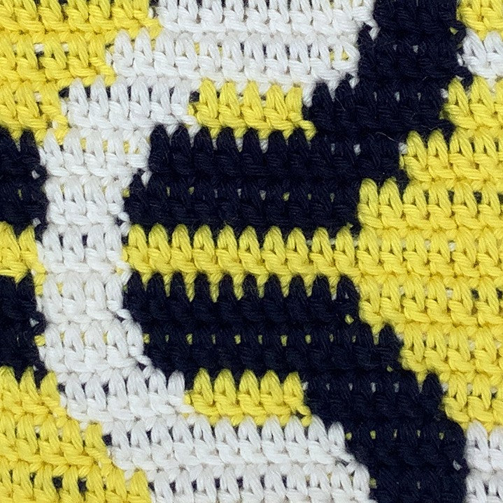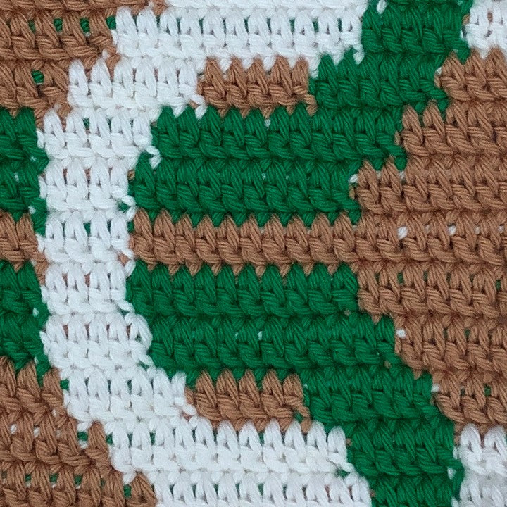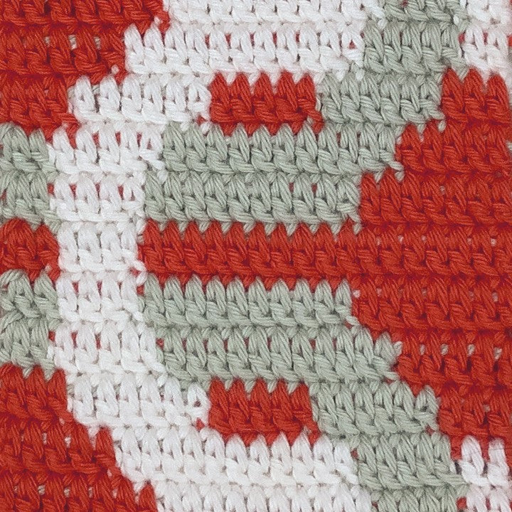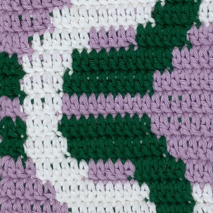 Teknikken er flerfarve-hækling i stangmasker, mens bunden hækles i fastmasker. Tasken hækles i vores 100% bomuldsgarn, og den monteres med en rem i kernelæder.