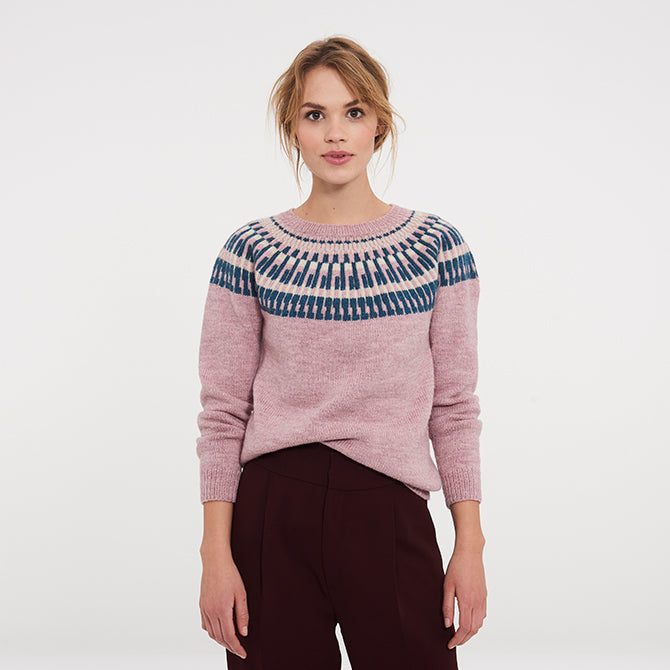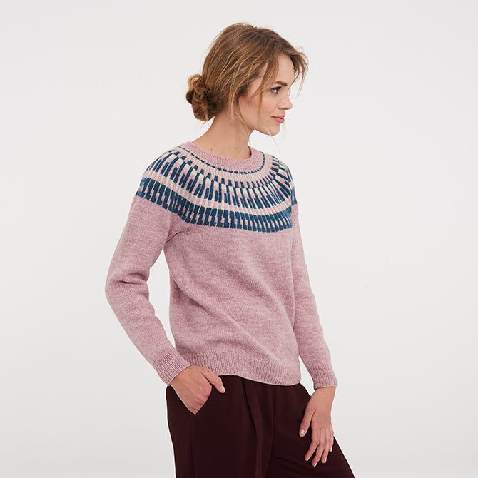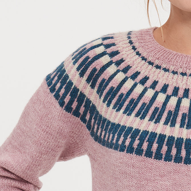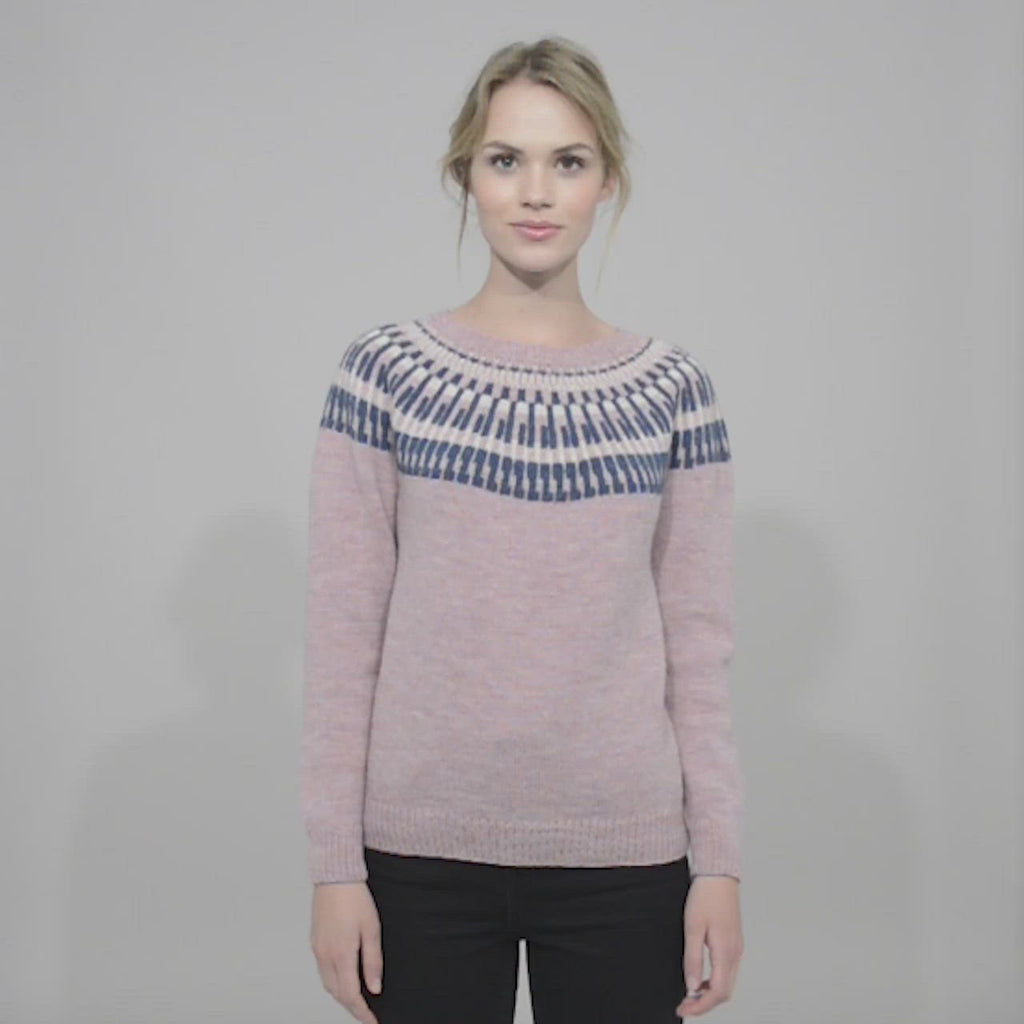 Røst Blusen er en ny fortolkning af signatur sweateren fra Island med det markante bærestykke. Røst fås i flere forskellige farvevarianter, som er inspireret af farveuniverset fra de traditionelle nordiske sweatre. Blusen strikkes i vores bløde Highland Mini i 100% uld.