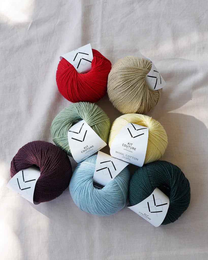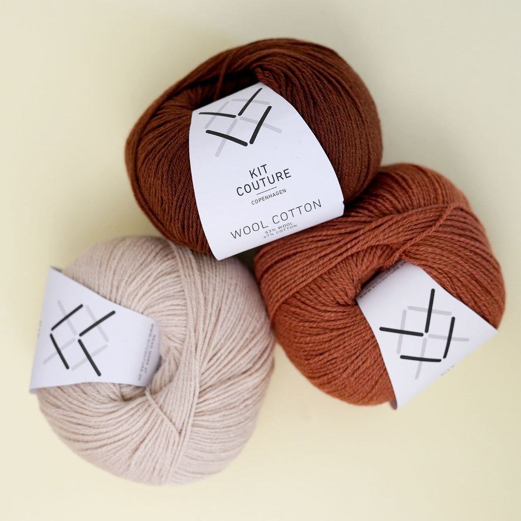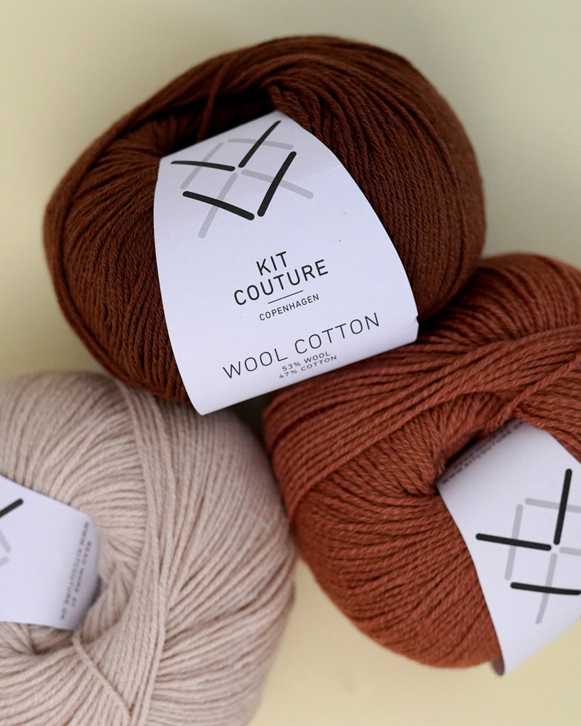 Det lækre Wool Cotton garn er et dejligt helårsgarn. Garnet er en blanding af uld og bomuld, som gør det både blødt og lunt. Wool Cotton garnet produceres i det nordlige Italien unikt til Kit Couture.